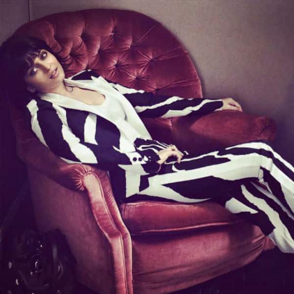 Next up is the monochrome Roberto Cavalli suit Ash is wearing as she sprawls on a comfy chair. What stands out in this look is her bangs. The hairdo is almost the same throughout the photo-shoot!